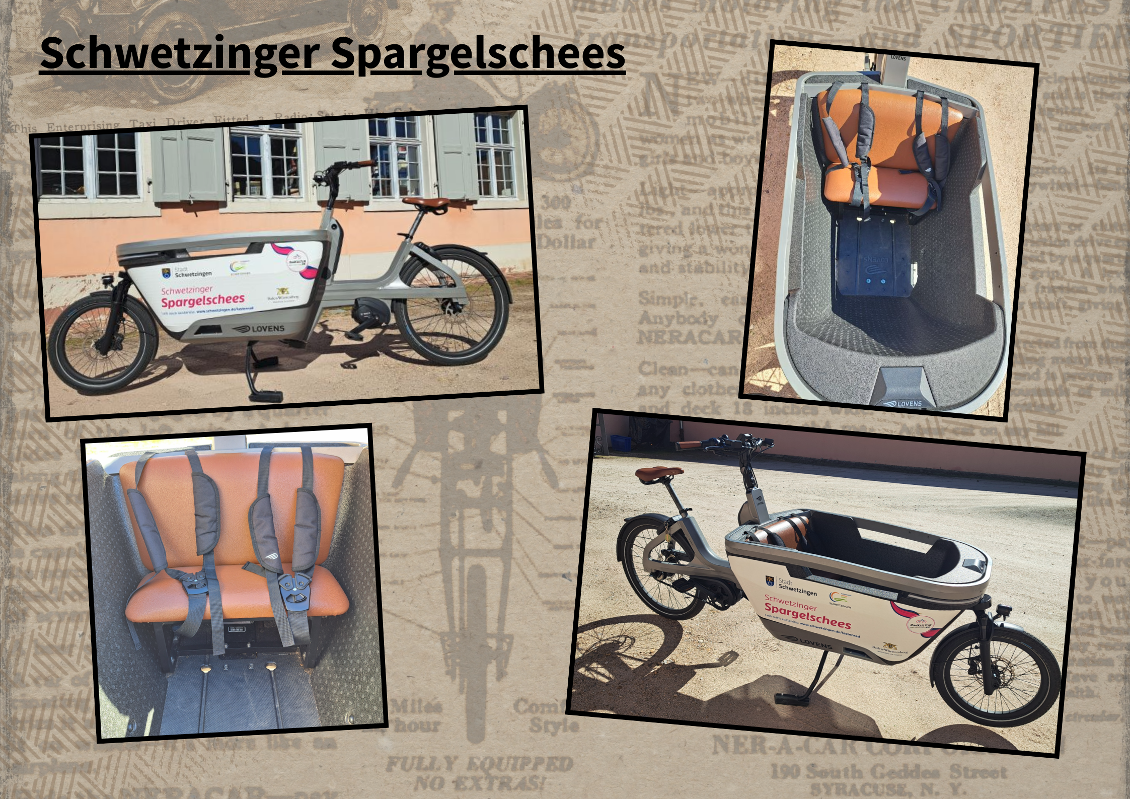 Sie möchten Kind & Kegel, Getränkekisten, Gartenabfälle, Kleinmöbel oder Großeinkauf transportieren? Oder überlegen selbst ein Lastenrad anzuschaffen und möchten einfach mal ausprobieren, wie es in Ihren Alltag passt? Dann sind Sie hier genau richtig. Mit unserem Lastenrad "Schwetzinger Spargelschees" sind Sie umweltfreundlich mobil - einfach ausleihen und losradeln!